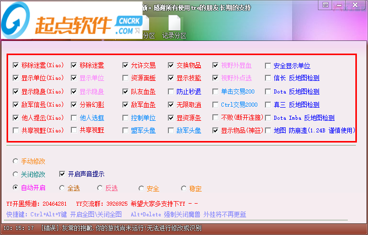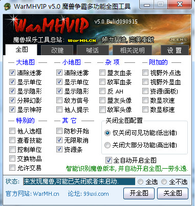 魔獸全圖工具是一款魔獸游戲地圖的作弊軟件。魔獸全圖最終版可以將地圖全部亮化,你只需要在軟件上勾選想要顯形的單位,即使是敵方的面板信息也可以一覽無遺,最終幫助你有效地贏得游戲勝利。該軟件還可以用作dota全圖工具、真三全圖工具?,F(xiàn)如今,浩方、vs上開全圖的人越來越多,相當(dāng)于大家都開了圖,不開圖的反倒吃虧。這款開全圖軟件能完美過vs和浩方平臺(tái),不僅全圖,還能偽裝名字,改名、顯隱身等等。