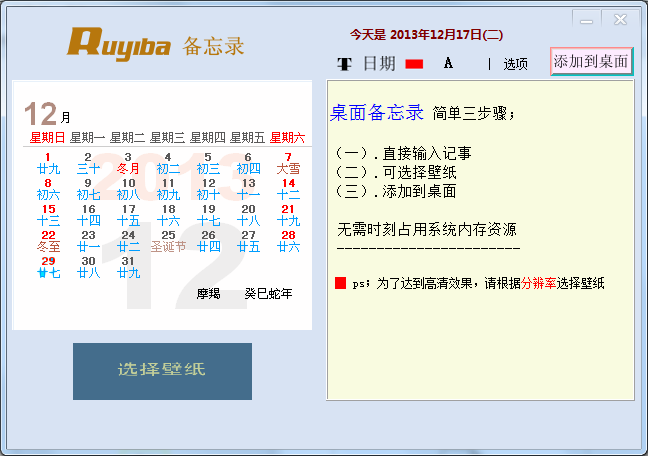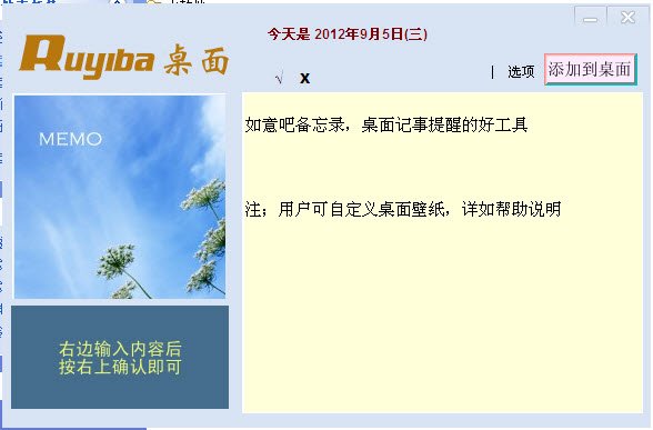 桌面?zhèn)渫?/strong>適合于經(jīng)常忘做一些要做的事情,結(jié)果經(jīng)常挨領(lǐng)導(dǎo)訓(xùn)的人。如意吧桌面?zhèn)渫泴?chuàng)意,想法及每天工作事項(xiàng)添加到桌面輕松提醒,可加入打鉤打叉,標(biāo)注事件是否完成?方便隨時(shí)修改內(nèi)容更新至桌面,簡(jiǎn)單操作不占用電腦資源及內(nèi)存。