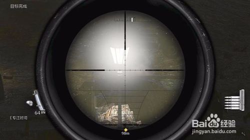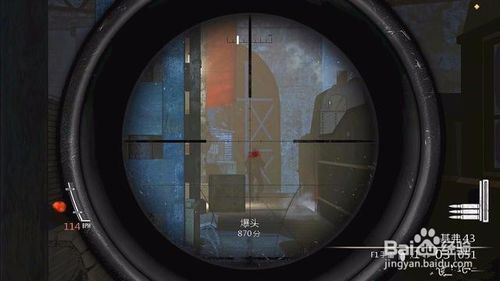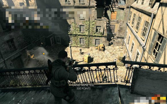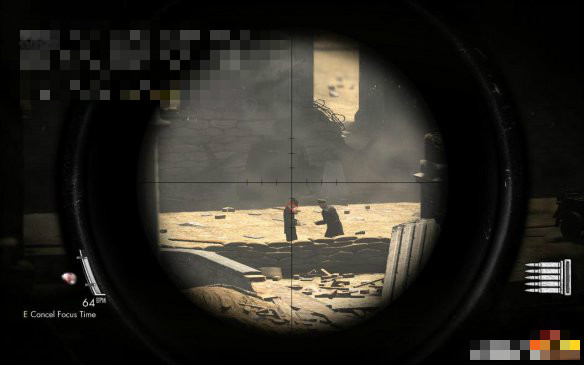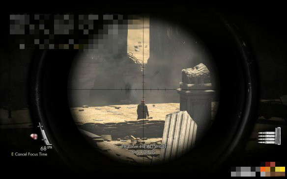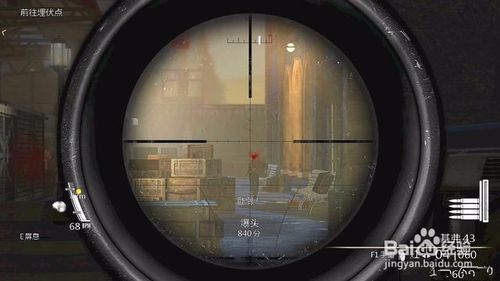 清空之后,前進(jìn)到場(chǎng)景中部,利用箱子作為掩體,將遠(yuǎn)處塔樓上的狙擊手爆頭狙殺。精英難度下面對(duì)面狙擊手心跳會(huì)急劇加速,需要快速調(diào)整好狙擊槍準(zhǔn)心進(jìn)行精確射擊。