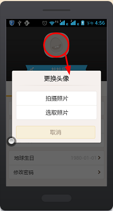 然后再點(diǎn)擊上方的圖標(biāo),彈出更換頭像對(duì)話框,可以選擇拍攝照片或選取照片,我們選“選取照片”項(xiàng)。