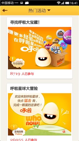 呼啦--全球第一款由電視媒體出品、面向客廳用戶的移動(dòng)互聯(lián)應(yīng)用。由湖南衛(wèi)視出品,上海宏蝠網(wǎng)絡(luò)開(kāi)發(fā)和運(yùn)營(yíng)的一款電視互動(dòng)社交應(yīng)用。為了讓整個(gè)激勵(lì)機(jī)制與湖南衛(wèi)視的節(jié)目關(guān)聯(lián)起來(lái),除了部分任務(wù)可以在線下完成外,大部分任務(wù)必須在電視機(jī)前觀看節(jié)目時(shí)完成。如果自己當(dāng)時(shí)不在電視機(jī)前,也可以委托朋友或者家人幫自己獲得積分,但是由于任務(wù)與當(dāng)時(shí)電視播放的節(jié)目有關(guān),并且有時(shí)間限制,因此委托人也必須當(dāng)時(shí)在電視機(jī)前,這樣保證了人們會(huì)時(shí)刻緊跟湖南衛(wèi)視的電視節(jié)目。