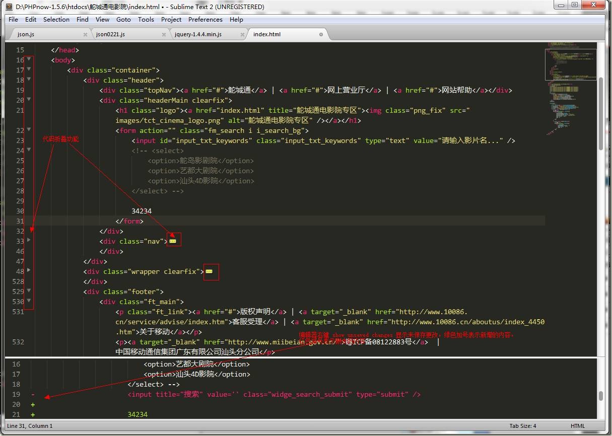 這是我們主要的工作區(qū)域,ST2支持代碼自動(dòng)縮進(jìn),代碼折疊功能。