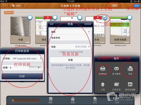 打印文檔:選擇“編輯”,再選擇具體的文檔,在刪除文檔一欄最右邊有一個“分享”的圖標(biāo),里面有打印和傳真發(fā)送的按鈕。你還可以進(jìn)入文檔查看頁面,選擇“分享”按鈕。在文檔的單頁也可以選擇“分享”按鈕來打印或是傳真發(fā)送此單頁!選擇打印,查找打印機(jī),調(diào)整打印頁數(shù)(單頁打印無此選項(xiàng))和打印份數(shù),開始打印。