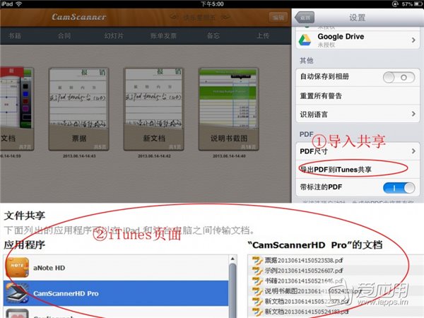 iTunes 導(dǎo)出:選擇“操作”,選擇設(shè)置,在設(shè)置中滾到 PDF 欄下,你可以設(shè)置好 PDF 的尺寸再導(dǎo)出。尺寸設(shè)置 好之后,選擇“導(dǎo)出 PDF 到 iTunes 共享”。導(dǎo)出的同時,可以選擇是否將標(biāo)注也包含在內(nèi)。當(dāng)導(dǎo)出完成后,連接設(shè)備到 iTunes ,選擇應(yīng)用程序,一直翻到下面的“文件共享”。選擇“掃描全能王”就可以在右側(cè)看到剛剛導(dǎo)出的 PDF 文件。選擇想要導(dǎo)出的文件,點(diǎn)擊底部的“保存到”將文件保存到電腦。