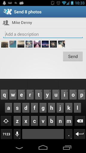手機對手機 發(fā)送照片給另一個Kicksend Android phone用戶,對方能立刻查看照片并將其保存到自己的手機上! 手機對臺式電腦 發(fā)送照片給另一個Kicksend 臺式電腦用戶,對方能立刻下載并將其保存到自己的硬盤上!手機對電子郵箱 直接給任何電子郵箱地址發(fā)送。我們會處理剩下的事情! 查看照片 其他Kicksend用戶能直接發(fā)送照片到你手機上,你可以直接查看,或保存照片到手機,私下寫回信!Kicksend是款跨網(wǎng)頁、移動手機和臺式電腦等平臺的應(yīng)用程序。軟件完全從零開始設(shè)計,旨在為普通大眾打造超級好用的程序。