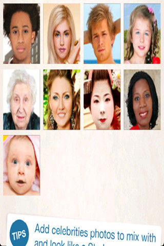 想知道自己變成女人是什么樣子嗎?想知道自己回到小時(shí)候又是多么可愛嗎?又或者變成帥哥或者美女呢?只要拍張照片或者在相冊(cè)中找一張?jiān)瓉淼恼掌?,然后?duì)準(zhǔn)自己的臉型,再找一張游戲自帶或者用你女友/男友的照片,合成,等待...然后開心的時(shí)刻來臨了:你會(huì)看到自己另一個(gè)樣子,或者和自己愛的人合成一張照片后的樣子!很奇妙呢!!也許會(huì)有點(diǎn)可愛,或者搞笑,但是我們不就是為了開心而玩這款游戲的嗎?趕快下載下來和朋友一起分享吧!