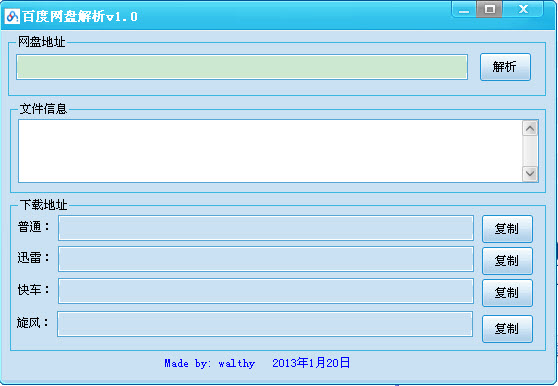 百度網(wǎng)盤地址解析器 1.0 免費(fèi)版 吾愛百度網(wǎng)盤地址解析器是一款綠色免費(fèi)的百度網(wǎng)盤下載工具,通過使用這款軟件,您可以直接將自己需要下載的百度網(wǎng)盤資料的網(wǎng)址復(fù)制到該軟件的網(wǎng)址欄中,然后點(diǎn)擊解析下載即可進(jìn)行下載,操作簡單,而且實(shí)用,值得下載!
