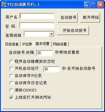 YYJ自動撥號是一款自動撥號上網(wǎng)軟件,有自動撥號、自動斷線換IP等功能,選擇連接線路,里面的選項(xiàng)是系統(tǒng)已存在的撥號連接,按界面提示,就能設(shè)定其他運(yùn)行參數(shù)。新版本中改寫了日志信息的保存方式,ping記錄獨(dú)立保存為1個文件,方便查看網(wǎng)絡(luò)質(zhì)量。
