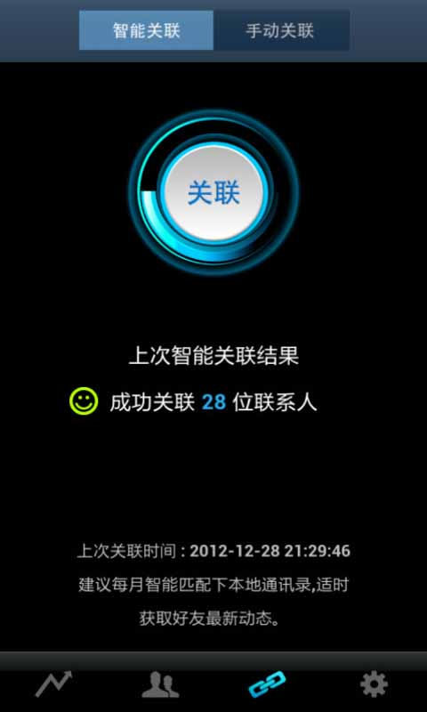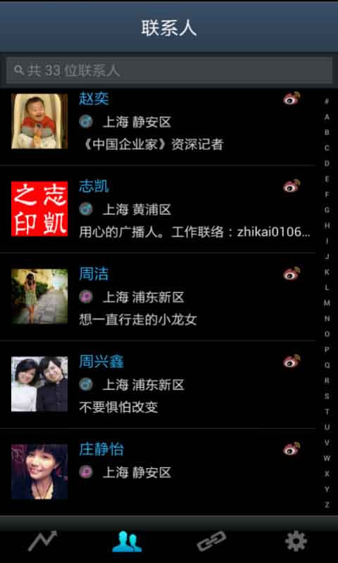 1、關(guān)聯(lián)功能:通過智能關(guān)聯(lián)或手動關(guān)聯(lián),將通訊錄和新浪微博平臺的好友關(guān)聯(lián)起來,即時了解聯(lián)系人的社交動態(tài)信息。2、一鍵合并:整合來自社交平臺的頭像、簡介、地區(qū)等個人資料,一鍵合并至本地通訊錄。