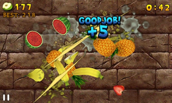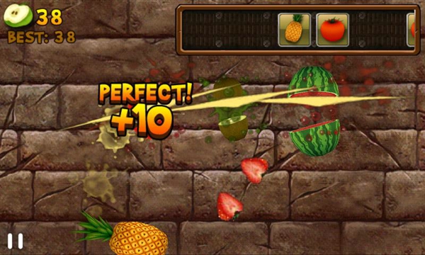 水果忍者作為一款簡單有趣的游戲,上市以來大受歡迎,名列apple store暢銷排行榜前十位。游戲畫面做的非常的精致,切開不同的水果,會開看到不同顏色的鮮艷果肉,而且做得逼真,可以看到果核,肉紋。各種顏色的果汁飛濺到半空,或者飛濺到墻上,為玩家?guī)泶碳さ囊暯求w驗。【操作技巧】