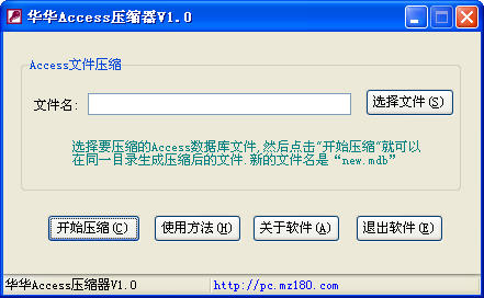 華華Access壓縮器 1.0 綠色版 華華Access壓縮器是一個實用的軟件,它可以很方便的壓縮你的ACCESS數(shù)據(jù)庫文件。優(yōu)化數(shù)據(jù),是站長必備的好工具。可以很方便的壓縮網(wǎng)站使用ACCESS數(shù)據(jù)庫的大小。減少對空間的占用。