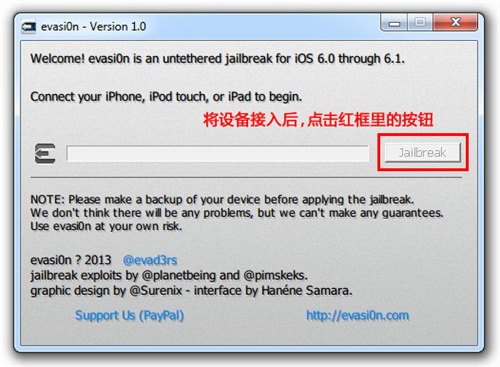 1、將下載到的ZIP包解壓到任意位置,打開Evasi0n.exe,然后連接設(shè)備到您的電腦: