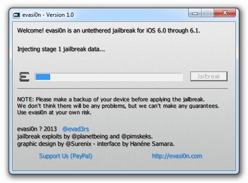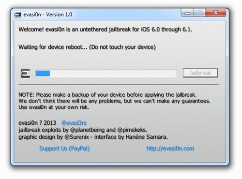 按照此前的承諾,黑客很快更新了iOS 6.x完美越獄工具到Evasi0n v1.4版本,最新版本的Evasi0n 可以支持蘋果今天更新的iOS 6.1.2進行完美越獄。如果你的iOS設(shè)備目前處于iOS 6.1.1或者更低的版本,而且你還希望升級到iOS 6.1.2并保持越獄,那么請備份你的設(shè)備,之后通過iTunes裝載6.1.2的固件(并不是選擇OTA無線升級),之后使用Evasi0n v1.4版本再次進行越獄。iOS 6完美越獄工具evasi0n今日正式放出,此次越獄工具支持iOS 6.0至6.1版本完美越獄,設(shè)備涵蓋所有支持iOS 6系統(tǒng)的iPhone、iPod touch、iPad以及iPad mini。越獄步驟簡單易操作,耗時約5分鐘。