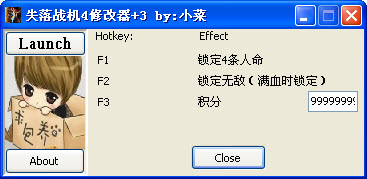 失落戰(zhàn)機4修改器是同名飛行射擊游戲《失落戰(zhàn)機4》輔助工具。失落戰(zhàn)機4修改器功能:F1 鎖定4條人命 F2 鎖定無敵滿血鎖定 F3 積分無限,修改為指定值