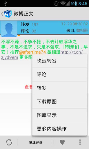 AK微博AKWBO是由archko開(kāi)發(fā)的Android版新浪微博第三方客戶(hù)端。立志作最優(yōu)秀的第三方客戶(hù)端。