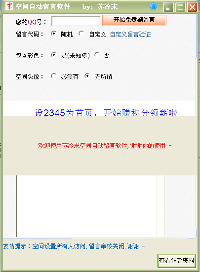 蘇冷末空間自動留言軟件 1.0 綠色版 蘇冷末空間自動留言軟件是一款免費刷QQ留言工具,可以設(shè)置隨機(jī)或者自定義的留言代碼,可以選擇是否包含彩色和空間頭像,趕緊下載使用吧。