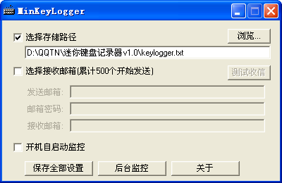 迷你鍵盤(pán)記錄器是一款體積小巧的鍵盤(pán)記錄器破解版工具。它能夠記錄所有鍵盤(pán)輸入信息。迷你鍵盤(pán)記錄器有兩種接收方式,一種是本地文件保存,需事先設(shè)定一個(gè)文本文件;另一種是郵箱接收,需填寫(xiě)好郵箱地址,發(fā)送郵箱最為關(guān)鍵,某些郵箱(比如QQ)需要開(kāi)啟smtp服務(wù)才能正常使用發(fā)送郵件的功能,郵箱密碼為發(fā)送郵箱的密碼,接收郵箱隨便填寫(xiě),可以與發(fā)送郵箱相同。
