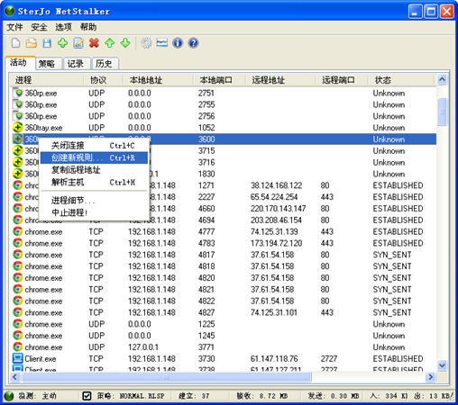 程序網(wǎng)絡(luò)連接管理(SterJo NetStalker),這是一個(gè)基于自定義網(wǎng)絡(luò)連接規(guī)則的防火墻工具,所有電腦上的應(yīng)用程序訪問(wèn)互聯(lián)網(wǎng)的連接信息都能被檢測(cè)并查看到:進(jìn)程名稱、UDP/TCP、本地連接地址、連接端口、遠(yuǎn)程端口、連接狀態(tài)等,看到可疑的網(wǎng)絡(luò)進(jìn)程直接就能將其kill掉,并且我們還能夠?qū)γ總€(gè)進(jìn)程指定不同的訪問(wèn)規(guī)則,簡(jiǎn)單易用。