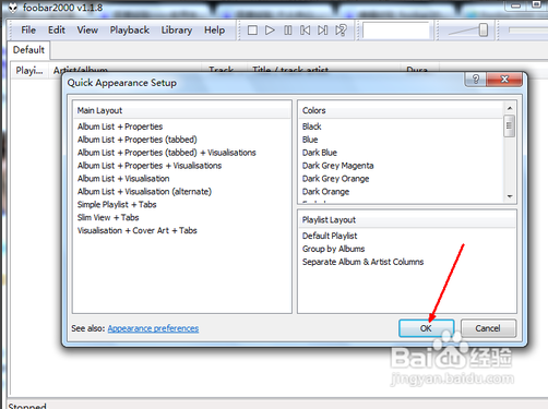 原版Foobar打開(kāi)之處會(huì)出現(xiàn)如下界面,選擇自己喜歡的布局點(diǎn)確定就行了。關(guān)于原版的默認(rèn)皮膚的美化即DUI配置美化,見(jiàn)此貼:http://tieba.baidu.com/p/2093467342 很多漂亮的界面都是CUI配置,有些人也想著自己做一個(gè)屬于自己的界面,但是CUI配置掌握太難,所以簡(jiǎn)單實(shí)用DUI配置就是首選,DUI配置就是在原版的基礎(chǔ)上對(duì)默認(rèn)布局的自定義設(shè)計(jì),很受一些老用戶的歡迎。