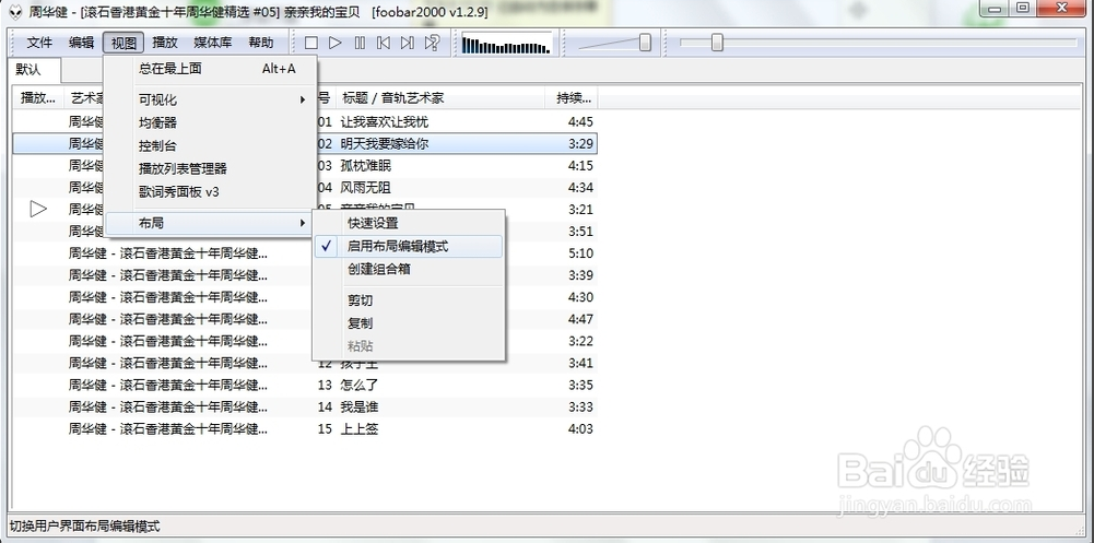 檢查“視圖--布局--啟用布局編輯模式”是否已經(jīng)勾選,若已選則用鼠標(biāo)移到要放置歌詞的模塊上,點(diǎn)擊右鍵出現(xiàn)“替換新的用戶界面組件”,即可進(jìn)入。
