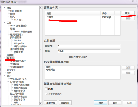 2.進(jìn)入?yún)?shù)選項(xiàng)后,首先設(shè)置自己的媒體庫(kù)(如下圖),如果下載的懶人包上有別人的歌曲列表(當(dāng)然是播放不了的),可以刪掉他設(shè)置的媒體庫(kù)和播放列表(建議選中后用delete鍵)。