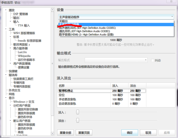 3.輸出設(shè)備設(shè)置(見(jiàn)下圖),一般選中主聲音驅(qū)動(dòng)程序,其他的選項(xiàng)取決于你電腦的聲卡驅(qū)動(dòng)類型,自己嘗試下不同吧。