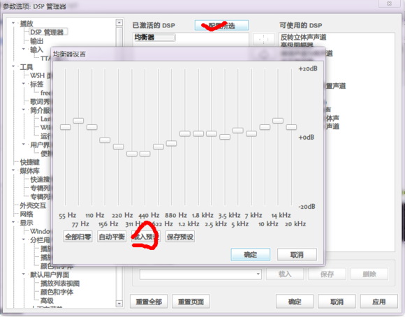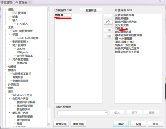 4.DSP管理的設(shè)置,dsp是數(shù)字信號(hào)的處理,我們可以理解為音效處理。新手建議使用均衡器就可以了,對(duì)于其他音效插件(dfx,BBE,重低音,杜比環(huán)繞以及各類音效)的使用,以后會(huì)在那些音效插件里講到。