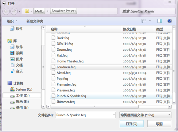 PS:預(yù)設(shè)文件一般在foobar程序文件夾的Equalizer Presets文件夾了,若無(wú)此文件夾,可以去下載。一般原因是你下的懶人包沒(méi)有這些配置文件或者你在安裝程序包時(shí)沒(méi)有選中”均衡器配置文件“,可以自己去嘗試調(diào)下均衡器,調(diào)一個(gè)自己聽(tīng)得慣的保存起來(lái)。