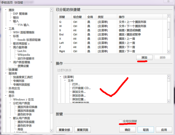 5.快捷鍵的設(shè)置:快捷鍵的使用會(huì)極大的帶來(lái)操作的便捷感,特別是全局快捷鍵(在上網(wǎng),看電影,打游戲時(shí)切歌,切播放列表,切foobar界面,調(diào)音量什么的)。這兒我說(shuō)下自己常用的幾個(gè)快捷鍵:ctrl+方向左右鍵是全局的左右切歌;ctrp+方向上下鍵是全局調(diào)音量;ctrp+END是全局暫停/播放;alt+方向左右鍵是全局快進(jìn)/后退;ctrl+s是全局的顯示隱藏foobar;其他快捷鍵還有”播放下一個(gè)播放列表“、”隨機(jī)播放“等。至于設(shè)成什么鍵大家按喜好來(lái)就行,shift鍵也很有用~