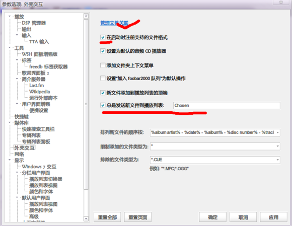 6.文件關(guān)聯(lián)設(shè)置:文件關(guān)聯(lián)是指將各格式的音樂(lè)文件(mp3,aac,flac,ape,cue,tak,wav,wma等)關(guān)聯(lián)到你那個(gè)foobar上,就是雙擊音樂(lè)文件后是用那個(gè)foobar打開(kāi)的,那個(gè)音樂(lè)文件也是foobar的關(guān)聯(lián)圖標(biāo)(我會(huì)分享一些好看的關(guān)聯(lián)圖標(biāo))