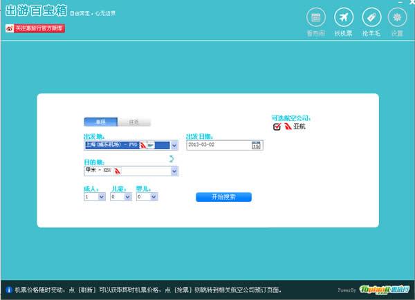 出游百寶箱目前可以查詢亞洲航空、宿務太平洋航空、捷星航空與及老虎航空四家航空公司的實時機票價格。出游百寶箱的定位并不是“搶票器”,雖然它對自由行驢友們在飛東南亞的四家大的廉價航空公司舉辦機票大促銷時搶先一步訂到心宜的機票很有幫助。