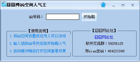 囧囧網(wǎng)QQ空間人氣王是一款可以幫助用戶免費刷空間人氣的工具,用戶只需在軟件中輸入QQ號碼,然后點擊“開始刷”即可刷QQ空間的人氣了。等幾分鐘打開你的空間看看人氣訪問量是不是咻咻咻的上升呢?