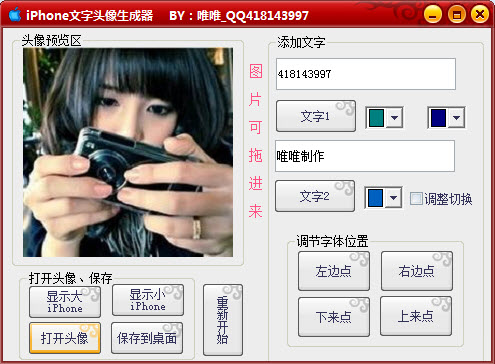 iPhone文字頭像生成器生成小iPhone、大iPhone 可添加兩種文字隨意改變顏色。圖片可以直接拖放進(jìn)來一步保存到桌面,更方便更實(shí)用 精心制作 生成高清頭像 。建義使用圖片100*100 200*200