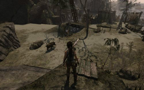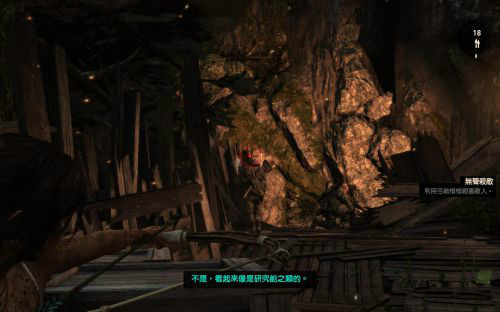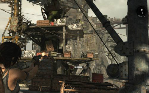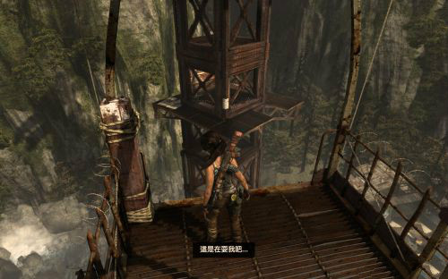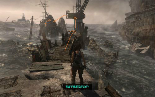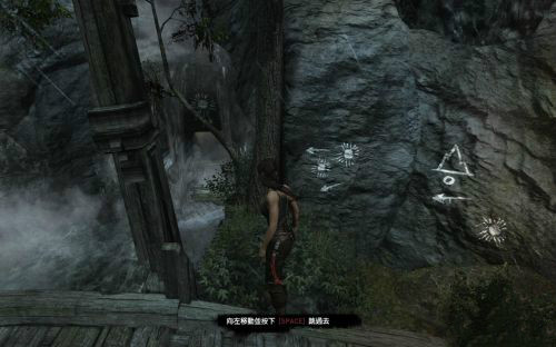之后看好子彈時間的時候按shift降落到另一端繩橋上,最后勞拉會落入水中,我們需要在激流中用散彈橋打破障礙物來到海灘.