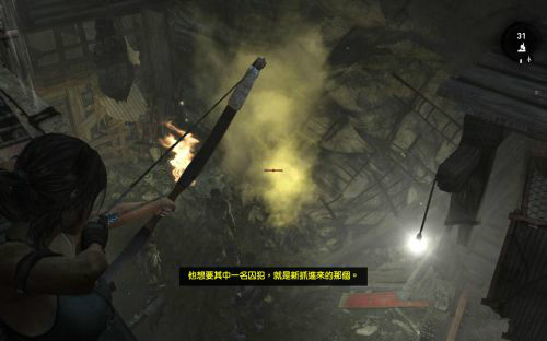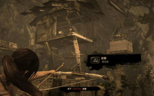 這里我們按照下圖指示爬到樹干上,然后趁尸體搖擺到我們身邊是伸手去拿弓