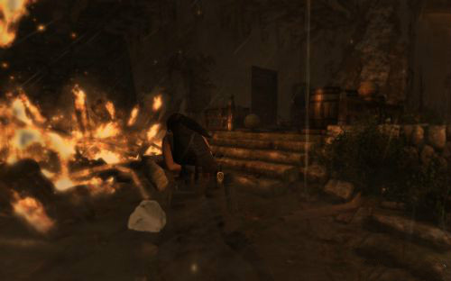火勢會不斷蔓延至對面引燃油桶從而炸出一條生路.路出來以后勞拉可以爬上前方的木臺,
