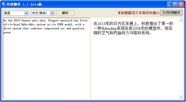 快捷翻譯工具是一款免費(fèi)的中英文翻譯軟件,能直接翻譯我們想要的英文段,且操作又不會太麻煩.該軟件大大節(jié)省了翻譯時間和翻譯步驟,開啟快捷翻譯時,選中一段要翻譯的文本,再按F2鍵就可以直接翻譯。