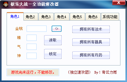 極樂大戰(zhàn)全功能修改器 1.0 綠色版 極樂大戰(zhàn)是一款以傳統(tǒng)大富翁為程序架構、以傳統(tǒng)神話故事西游記為背景的益智類游戲,為了增添游戲的樂趣,提供一款極樂大戰(zhàn)全功能修改器給大家使用。