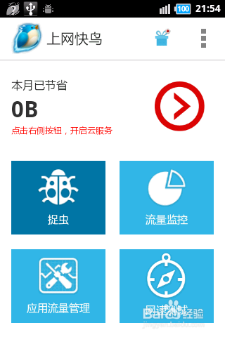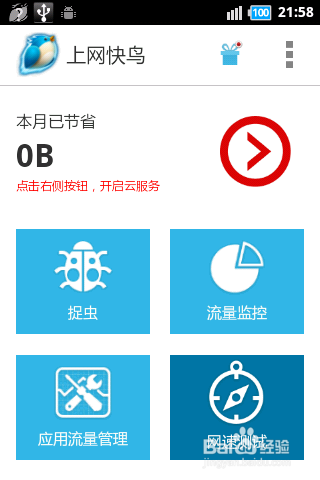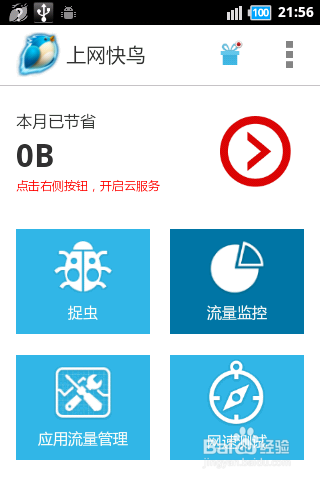 小編使用該應用的時候了解到,上網快鳥的云服務只能節(jié)省手機移動網絡環(huán)境下的流量,遇到WIFI環(huán)境會自動關閉?,F(xiàn)在開啟它的云服務功能,點擊“>”,或者在上網快鳥的“設置”菜單選擇“使用快鳥服務”,上網快鳥就可以在后臺運行監(jiān)控與節(jié)省流量的程序。