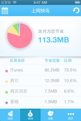 對于經常不在WIFI環(huán)境手機上網的用戶,上網流量的消耗越大,使用上網快鳥就越是節(jié)省。