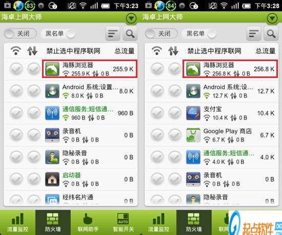 證明手機使用流量比較微小的時候,啟動上網快鳥反而損耗流量更大,下圖左側沒有啟動上網快鳥,用海豚瀏覽器訪問新浪頁面6次,流量消耗在255.9K;下圖右側使用上網快鳥,用海豚瀏覽器訪問新浪頁面6次,流量消耗在256.8K。當然,由于產生的是稀少流量,所以超出的那部分可以小到忽略。