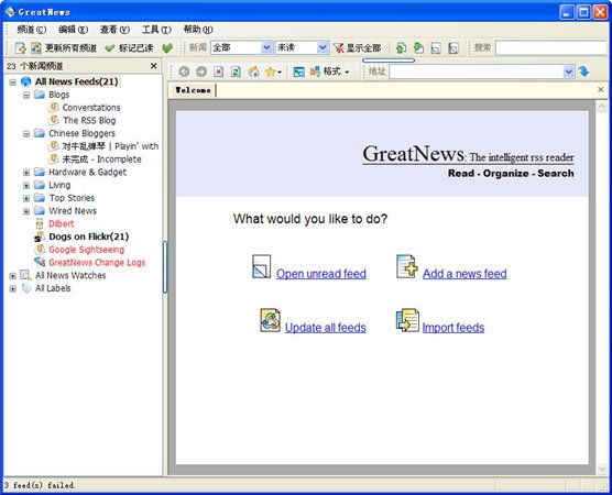 GreatNews,一款好用的RSS新聞閱讀器,速度超快,特別針對大量頻道同步更新而設計。GreatNews是一個市場占有率最大的rss客戶端閱讀器.