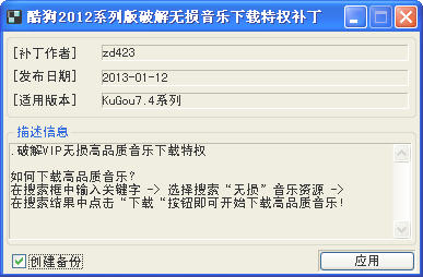 2012無損音樂下載補(bǔ)丁是可以破解酷狗vip無損高品質(zhì)音樂下載特權(quán)。