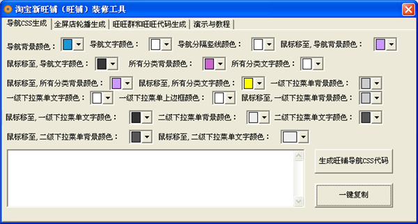 淘寶新旺鋪裝修工具支持導(dǎo)航CSS生成、全屏店輪播生成和旺旺群旺旺代碼生成功能,軟件內(nèi)附演示教程,幫助你輕松裝修新旺鋪,趕緊下載體驗(yàn)吧。