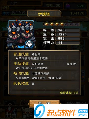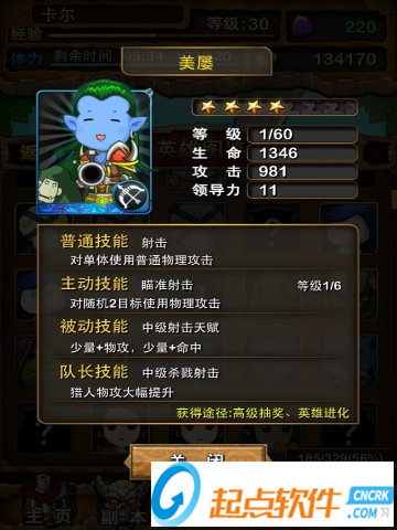 1. 第一種類型的獵人為生存能力較強(qiáng)的,被動(dòng)技能為回避和生命加成。配合主動(dòng)技能亂射(對(duì)后排目標(biāo)進(jìn)行物理攻擊),對(duì)切后排小怪效果比較明顯。如圖所示: