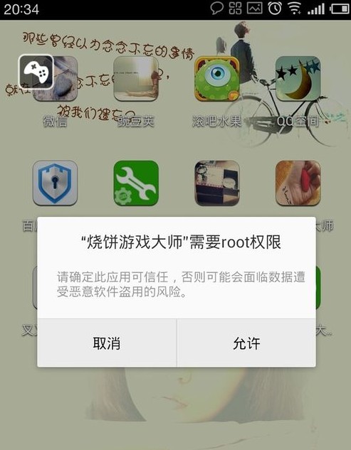 1、首先打開(kāi)燒餅游戲大師,小伙伴們會(huì)發(fā)現(xiàn)需要root權(quán)限,如果沒(méi)有root權(quán)限的朋友先進(jìn)行師一鍵root哦!然后有了root權(quán)限就可以點(diǎn)擊允許!