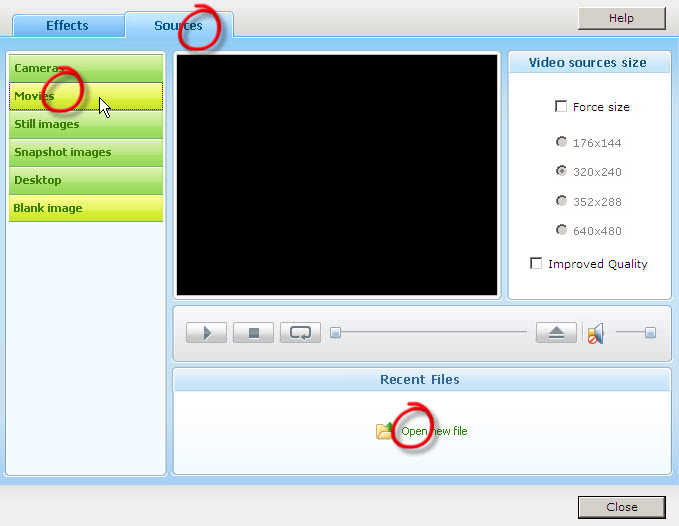 4. 使用假視頻,Sources(指定視頻源)->Movie(電腦視頻)->open new file(打開新文件)