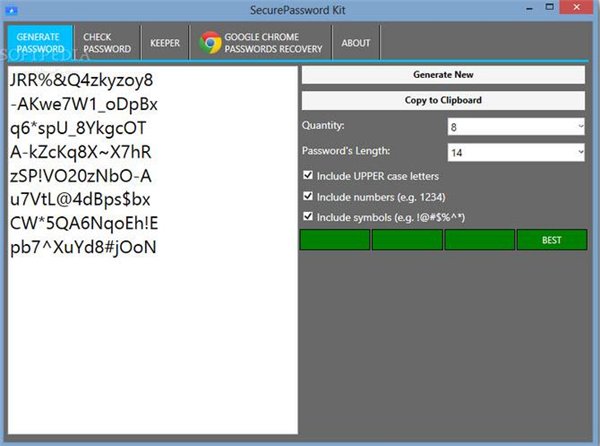 SecurePassword套件是一個用戶友好的應(yīng)用程序,使用戶能夠產(chǎn)生強(qiáng)大的密碼可以保護(hù)他們的在線隱私。 SecurePassword工具包還提供了一個有效的工具,它存儲為您的網(wǎng)上帳戶的密碼。此外,還可以依靠這個軟件解決方案中獲取存儲在谷歌瀏覽器里的密碼。