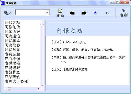 《成語速查3.6》修正了幾個BUG,目前收錄成語6500條。成語速查是一套成語查詢與學習兼顧的共享軟件,她為您提供強大的成語智能模糊查詢、復制、管理、打印、學習和保存等功能,可自定義字體大小和顏色,保護您的視力。簡潔友好的界面設計。每條成語注有拼音、解釋、近義詞、反義詞、出處、舉例、歷史故事等,是您查詢和學習成語的有力助手。2.收錄的成語科學實用。如果用戶確定注冊(15元/套),今后將免費升級到更高的版本。如果成語掌握到一定程度并善于運用它,您的語言將更加精煉優(yōu)美,出口成章,您的文章將更豐有文采