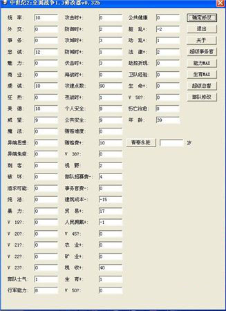 修改功能:統(tǒng)率,外交,事務(wù),忠實(shí),魅力,商業(yè),虔誠,狂熱,美德,威望,魔法,異異端思想,異端免疫,刺客,破壞